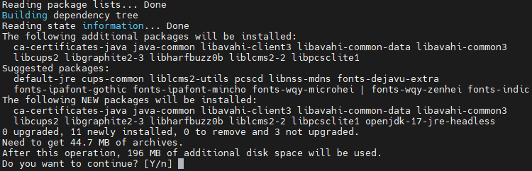 sudo apt install openjdk-17-jre-headless出现Do you want to continue? [Y/n]时输入Y,回车