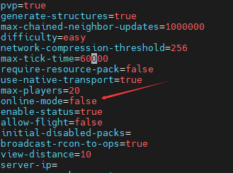 再里面找到online-mode,按下i键进入编辑模式,把后面的true改为false,然后按esc返回,再按左shift+; 输入wq,回车